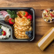 A sweet moment: pancakes served with cottage cheese, jam, chocolate cream, fresh fruit, and maple syrup